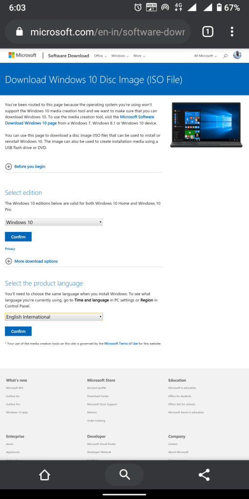 - Just visit the same link mentioned above with your Android or iOS smartphone. You will be taken to the Download Windows 10 page, but this time things will look a bit different.